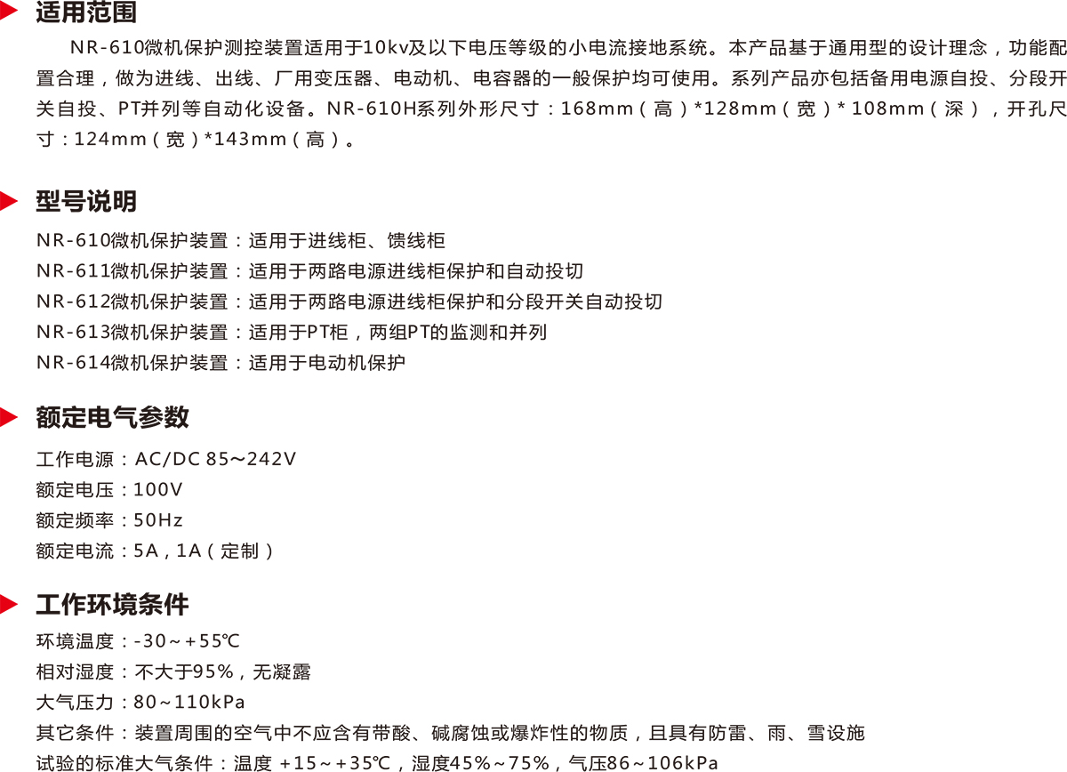 NR-610微机保护测控装置适用于10kv及以下电压等级的小电流接地系统。本产品基于通用型的设计理念,功能配置合理,做为进线、出线、厂用变压器、电动机、电容器的一般保护均可使用。系列产品亦包括备用电源自投、分段开关自投、PT并列等自动化设备。